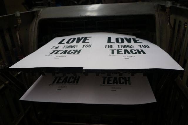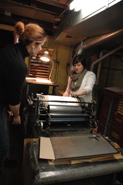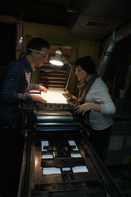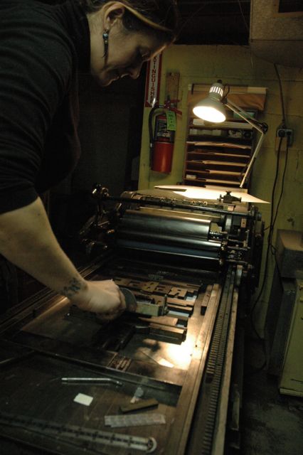 Here, Shannon is rolling over the blocks with the help of the lovely Ashley Town.  Ashley is a super talented lady, who took on this great project of owning a print shop.  Ashely had been working as a designer with the previous owner, Jim Baker, and eventually learned all about the machines and processes of printing.  And only about 6 months ago, Jim retired and with nobody to take over the business, it would have closed for good.  But Ashely stepped in and took over, and how she’s dedicated to maintaining the integrity of the machines, preserving its history, as well as making the art form available for others to practice.
