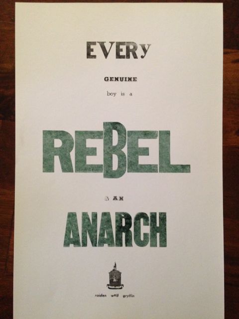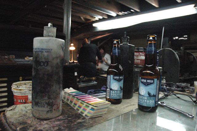I called up my friend Shannon yesterday morning and asked if she could come with me.  She said yes, I picked up a 6 pack of beer (my friends over at Central Waters Brewing Co. make some delicious stout, y’all), and we made our way to Bay View.  Shannon hadn’t done any printing before, but came away with one killer poster.  Above, she’d already set and locked up the blocks, and was inking them in green and black.
