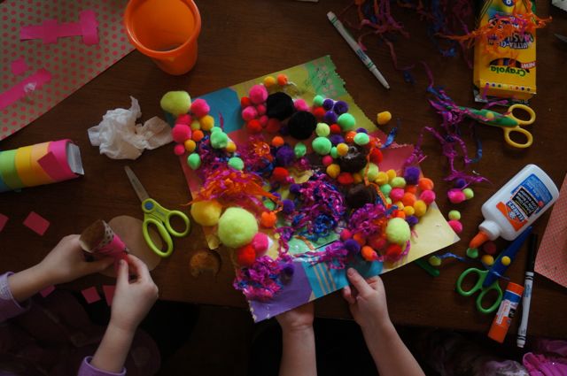 So back at the house, we got out our arts and crafts supplies, and went crazy.  A & V made some amazing 3D structures of houses, lamps and more.  I could tell that my kids hadn’t ever thought to build UP from their paper, and it opened a new facet of art for them!