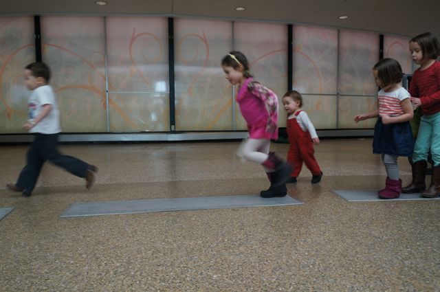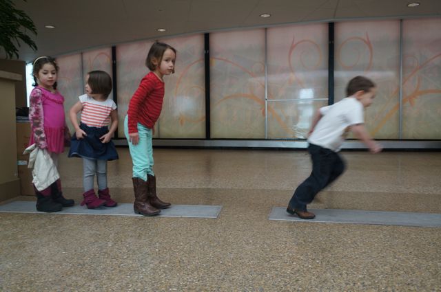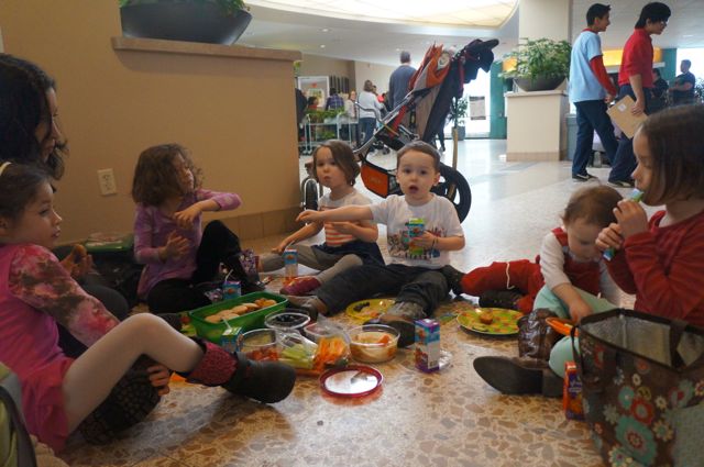 Because it had been like 60 whole minutes since my kids had eaten, they were starving and insisted on eating lunch.  We headed to the lobby to find a table, but because of the huge crowd, we settled in on the floor for a makeshift picnic of hummus, veggies, fruit, muffins and cheese.
