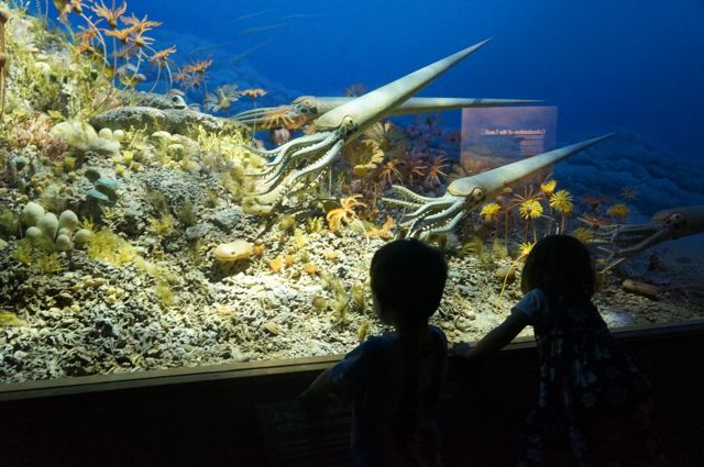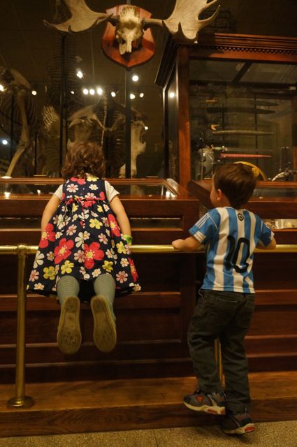 After the short planetarium show, the twins chose to see dinosaurs first. The above photo is approximately 2 seconds after I asked Little A to keep her feet on the ground.